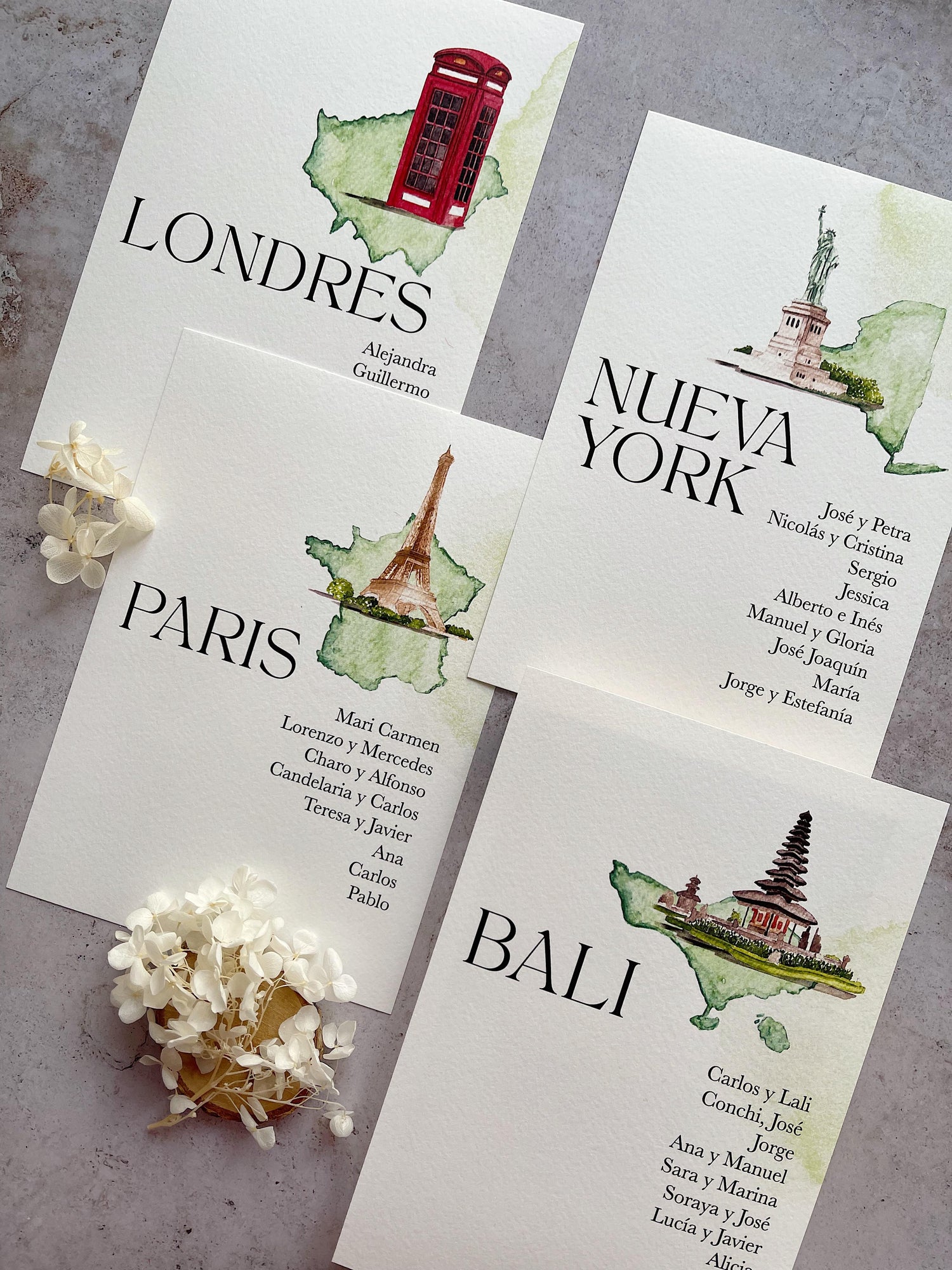 Ofrecemos la posibilidad de crear Seating plan totalmente personalizados con acuarelas pintadas a mano. Los novios pueden elegir la temática que más les apasione: viajes, coches antiguos, Star Wars, Marvel, Harry Potter, entre muchas otras opciones. Cada mesa se convierte en una obra única y original, pensada para reflejar la personalidad de los novios y sorprender a todos los invitados con un detalle exclusivo.