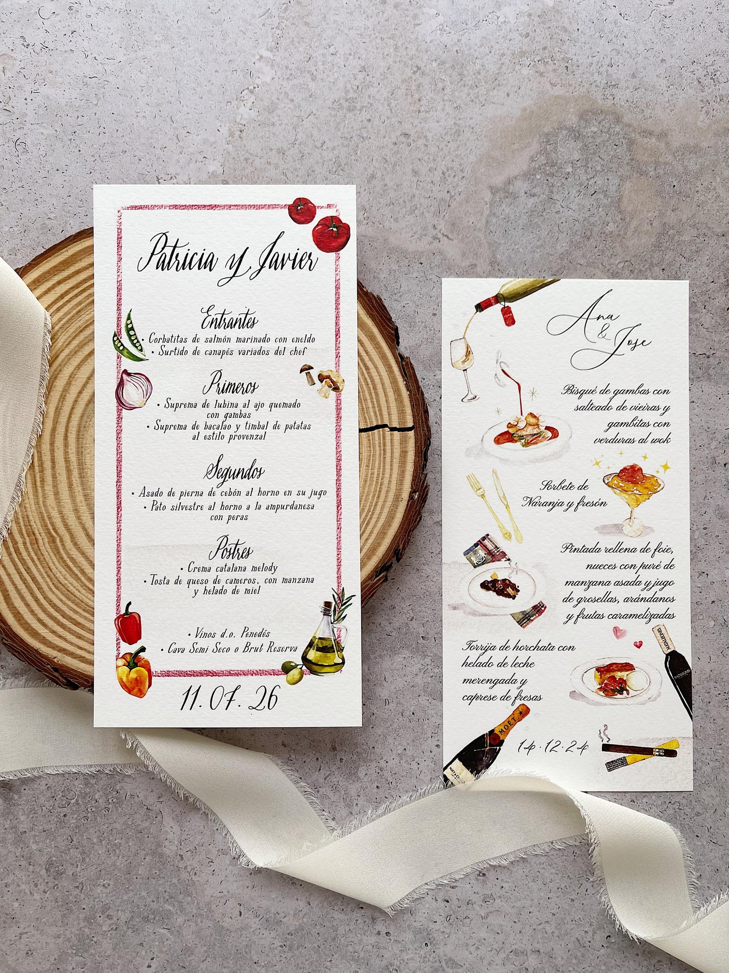 Creamos minutas que se alejan de lo clásico y habitual, convirtiéndolas en diseños únicos que marcan la diferencia en cada mesa. Con acuarelas pintadas a mano, ilustramos los platos originales del menú, ingredientes o elementos gastronómicos que reflejan la esencia de la celebración. Son minutas exclusivas que no se suelen ver en otras bodas y que transforman un detalle muchas veces olvidado en un recuerdo artístico y especial para los novios y sus invitados.