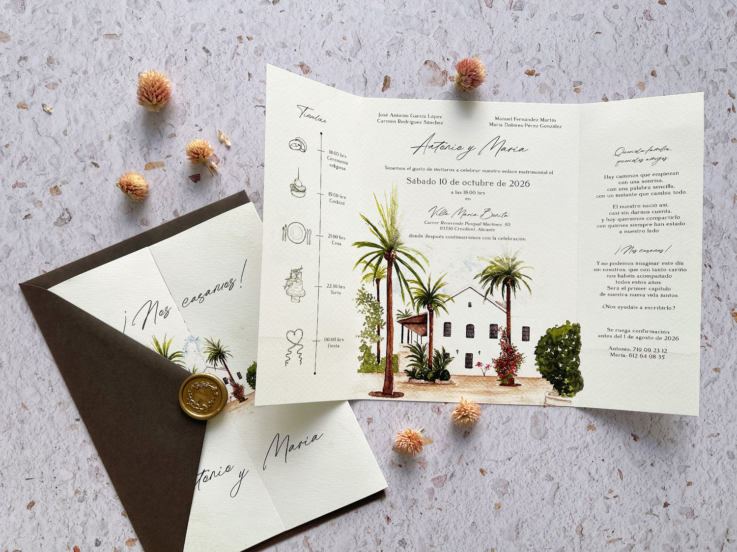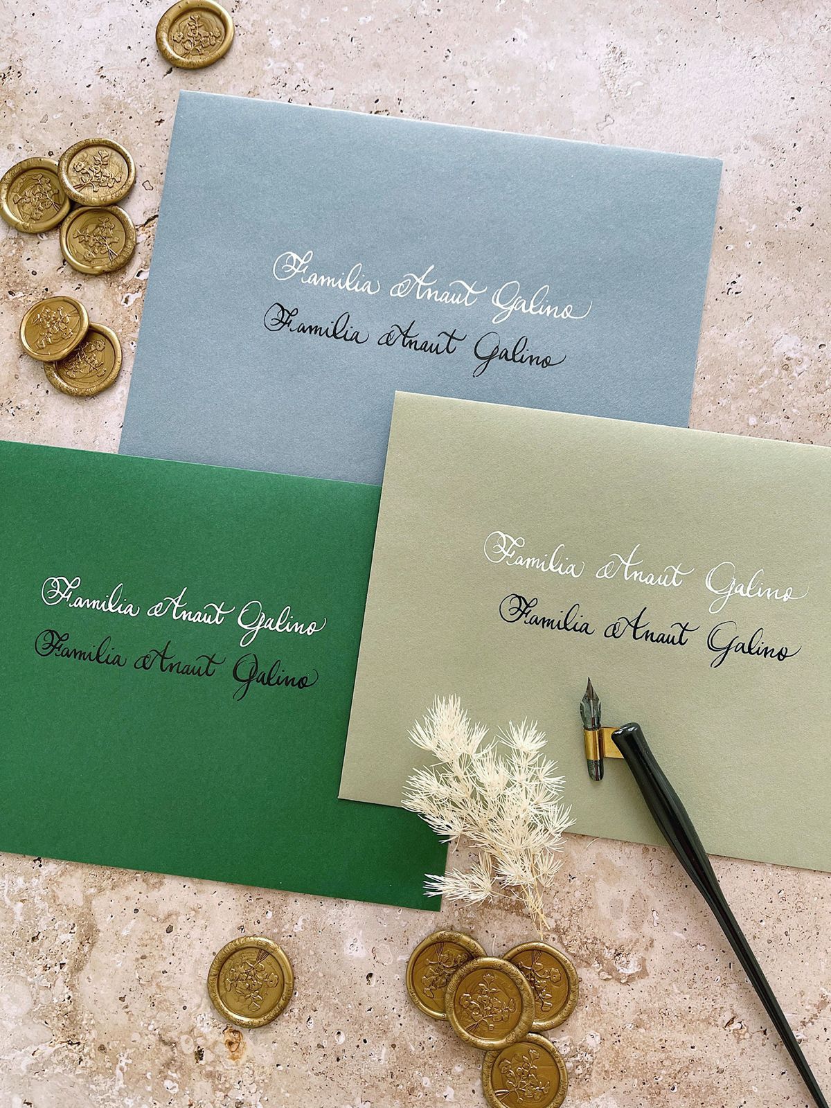 Todas nuestras tarjetas de bodas hechas a mano están pintadas con acuarelas y van acompañadas de sobres de boda premium. Nos encargamos de todo el proceso. Desde pintar las acuarelas y el diseño de la invitación de boda hasta la impresión.
