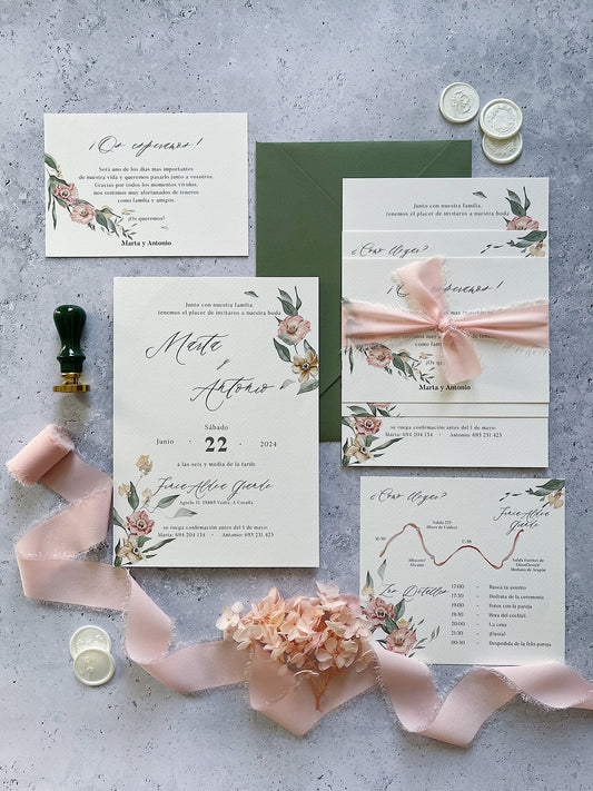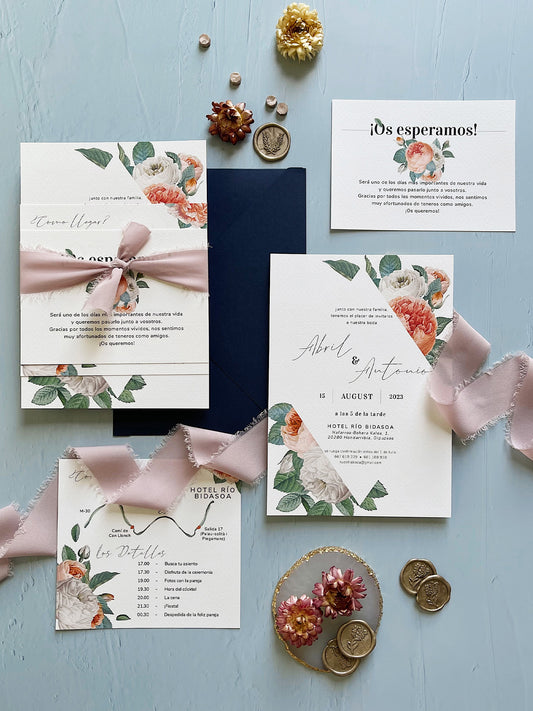 Las invitaciones de boda con flores son una opción hermosa y romántica para las parejas que quieren añadir un toque natural a sus invitaciones. Estas invitaciones suelen incluir elementos como flores naturales o diseños florales, y pueden ser hechas en colores cálidos como el rosa o el morado.
