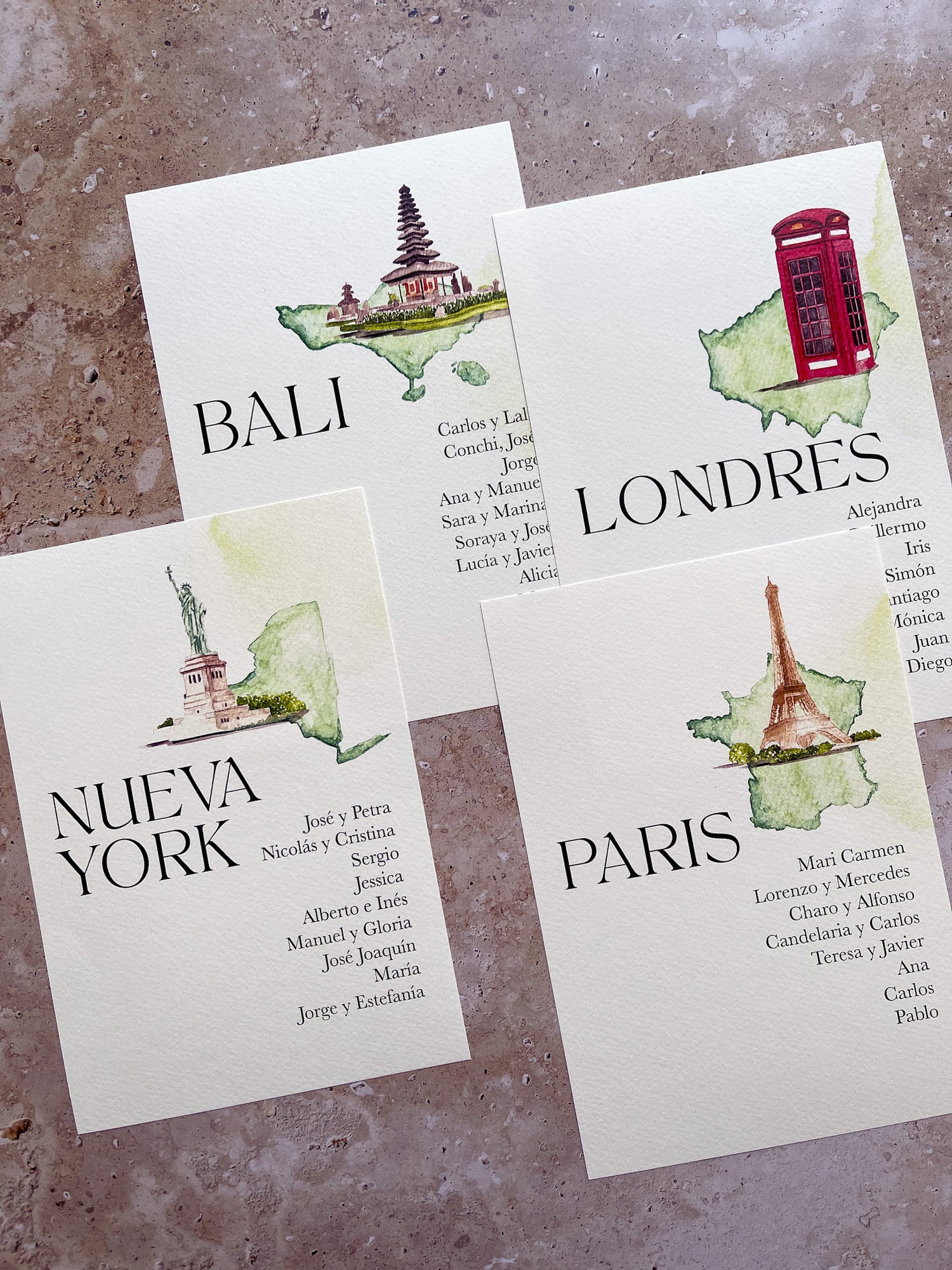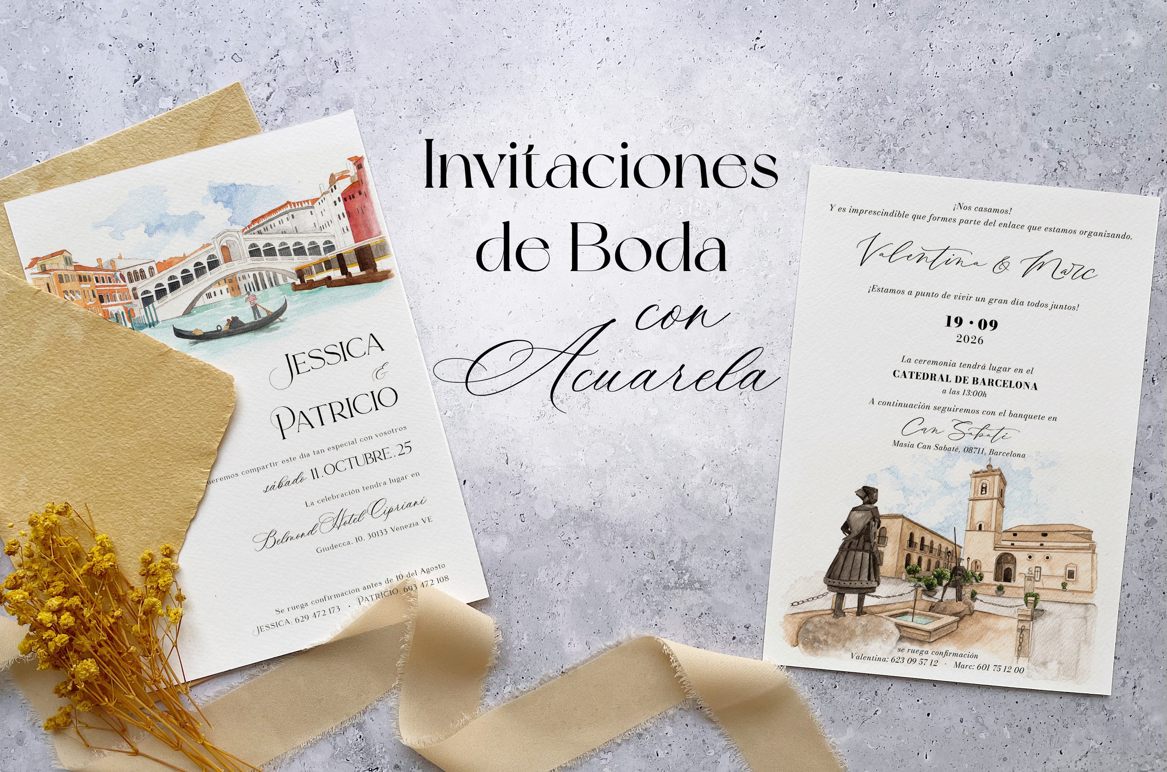 Pintamos acuarelas personalizadas a mano para crear unas invitaciones de boda únicas, exclusivas y muy originales. Las invitaciones de boda personalizadas con acuarelas son la elección perfecta para parejas que buscan tarjetas de boda especiales y totalmente personalizadas.