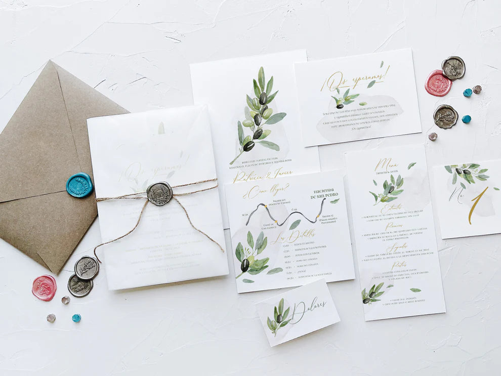 Incluye: La invitación de boda con el diseño que el cliente elija de nuestra colección, el sobre de boda, el sello de lacre y el montaje