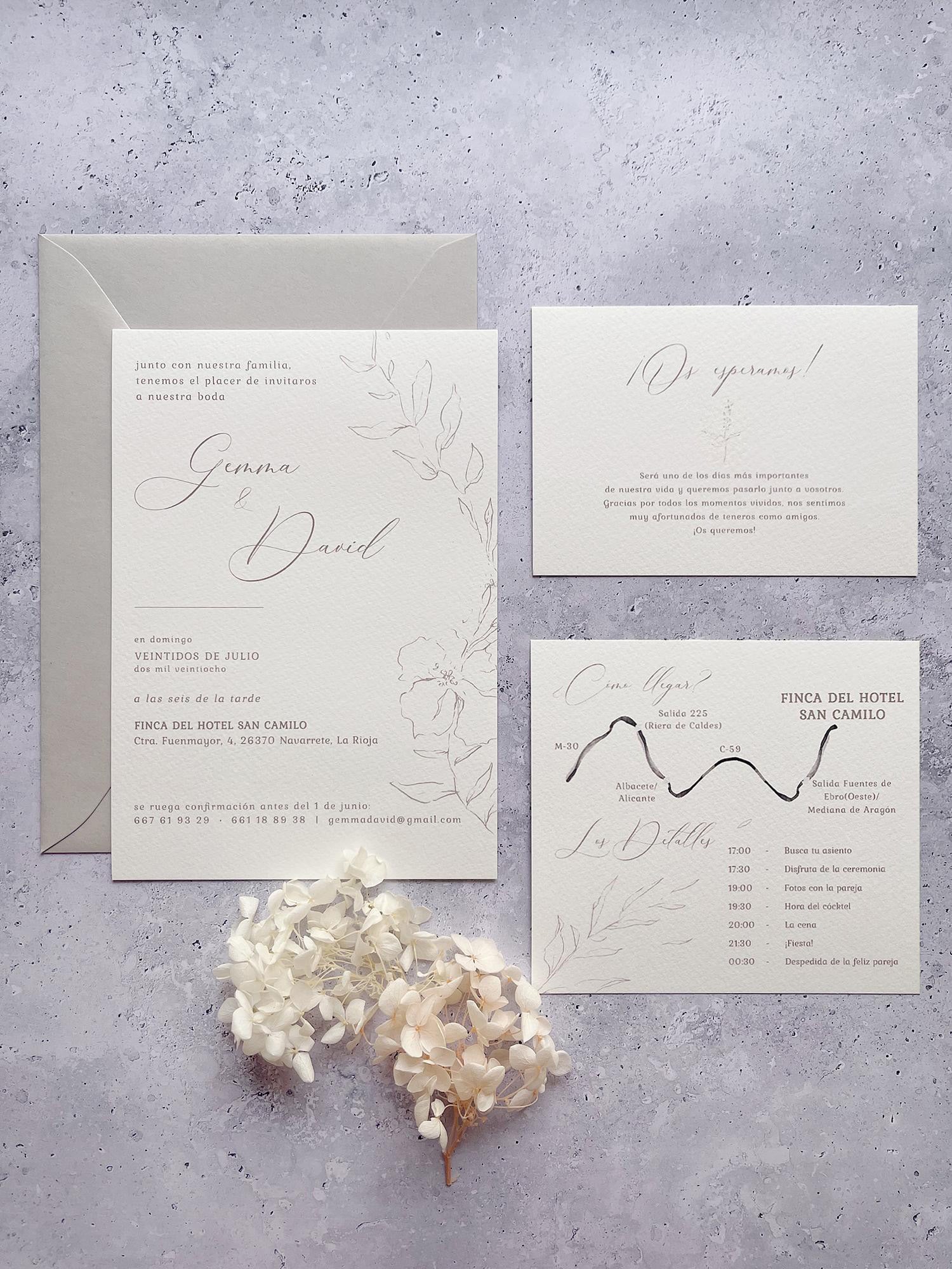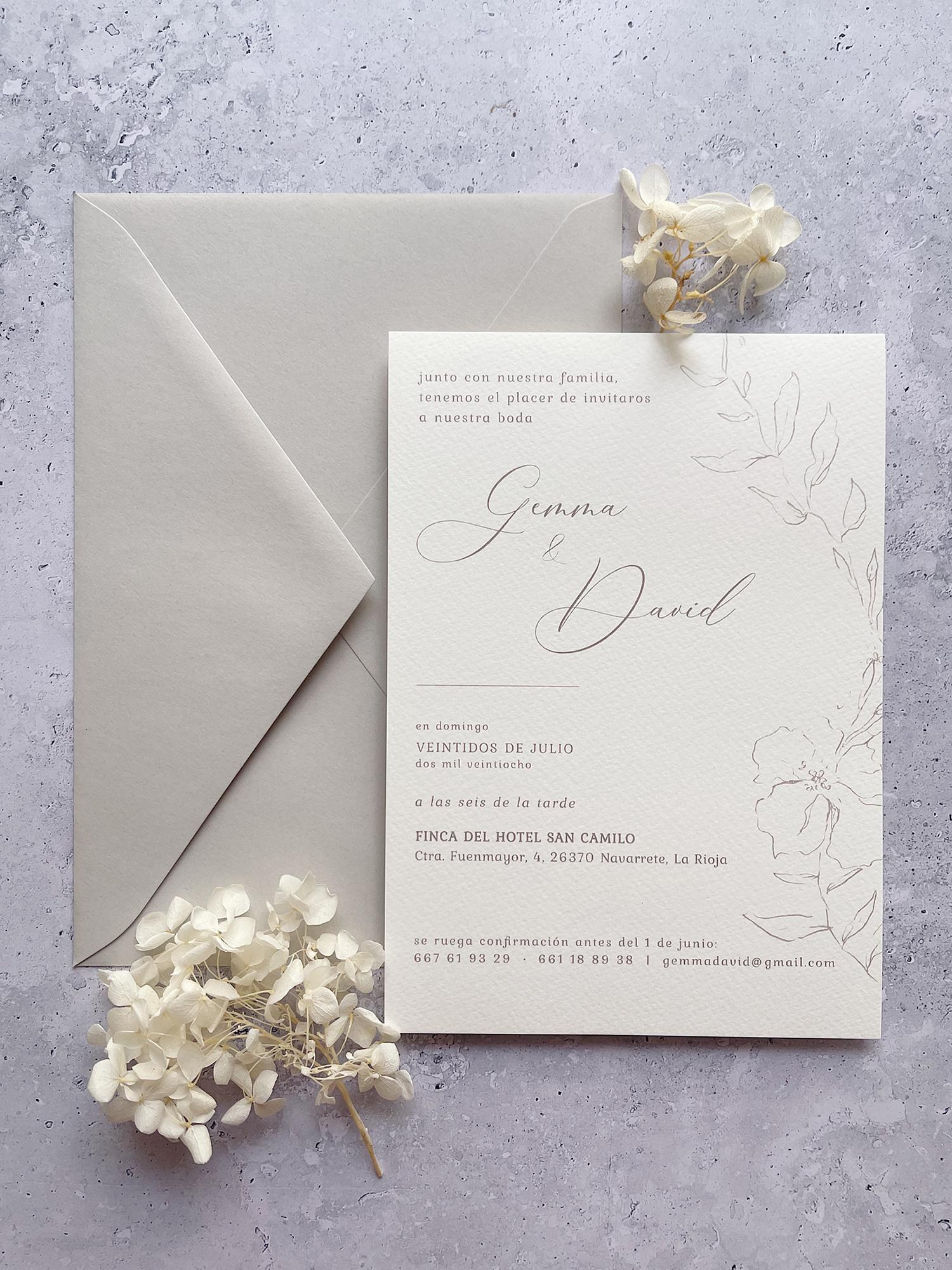 Todas las invitaciones vienen impresas en papel Fedrigoni Tintoretto 200 gr blanco con una textura muy fina y elegante